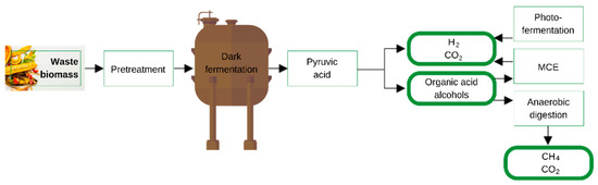 The maximum hydrogen production yield from the dark fermentation process is 4 mol H2 per hexose molecule, which is 33% (based on sugar) [67]. Therefore, byproducts that are generated during dark fermentation are a solution for increasing the efficiency of the process. Waste biomass should be converted into bio-H2 in two stages. The first stage is dark fermentation, which converts carbohydrates to hydrogen and organic acids/alcohols. In the second stage, the produced organic acids/alcohols are used in other processes to provide H2 and CH4 (Figure 3). The usual integrated mode is dark fermentation with anaerobic digestion and photofermentation [68,69].