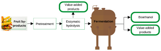 General steps in producing bioethanol and value-added substances from fruit byproducts.