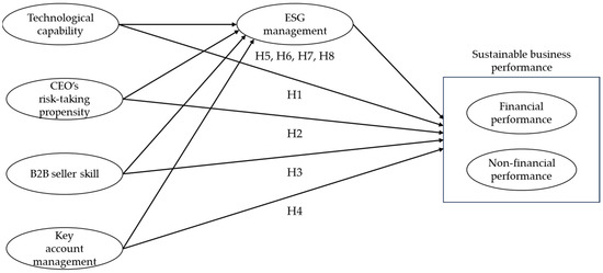 Based on the previous literature and the characteristics of the B2B industry, this research considers technological capability, the chief executive officer’s (CEO) risk-taking propensity, B2B seller skill, key account management (KAM), and environmental–social–governance (ESG) management as the main factors that might influence the sustainable business performance of B2B firms. Technological capability is a performance factor that is widely studied in many studies of both B2B and B2C. This study examines the role of this factor within a B2B environment. As competition in the industry intensifies and volatility increases, the CEO’s risk-taking propensity is selected to assess the impacts of managers’ proactive and bold attitudes on sustainable corporate performance. B2B seller skill and KAM are marketing characteristics unique to the B2B industry and have been studied overseas, but research on Korean companies is lacking. Thus, we look at how seller skill and KAM influence sustainable performance among Korean B2B companies. In particular, ESG management has recently emerged as a new paradigm in corporate valuation and is attracting attention as an essential element rather than an option for companies. Many foreign and Korean evaluation agencies (i.e., ISS-ESG, CDP, Sustainalytics, KCGS, etc.) are using various ESG evaluation metrics to evaluate sustainable management. Additionally, most sustainability management evaluation indicators and standards, including ISO 26000 [19], are centered around ESG. This reflects the fact that ESG serves as a standard for evaluating corporate sustainability and can have a long-term impact on a company’s business strategy and performance. In this study, we seek to determine the impact of ESG management on corporate sustainable performance.