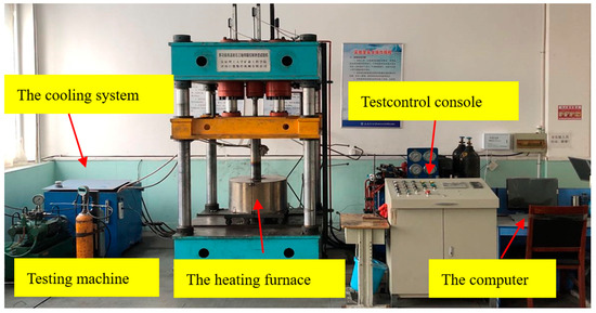 The self-developed multi-function servo control testing machine is adopted, as shown in Figure 1. The equipment is composed of axial loading system, high temperature heating system, circulating cooling system, test console, and data acquisition instrument. The uniaxial compression test bench is mainly composed of heating furnace, uniaxial compression furnace, and holding furnace. The maximum temperature in this test can reach 600 °C. The maximum allowable loading stress of the equipment is 100 MPa.