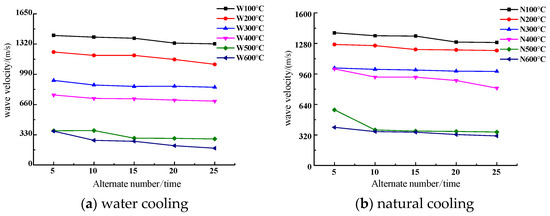 As can be seen from the average wave velocity at different temperatures and under the action of cold and hot cycles in Figure 3, the change in wave velocity presents a downward trend as a whole. The variation rule of wave velocity is obtained from five aspects: the wave velocity decreased with the gradual increase in temperature. With the increase in the number of cycles, the wave velocity of the samples at the same temperature also showed a downward trend, but the downward trend was relatively slow. The wave velocity of the two cooling methods also showed a downward trend with the increase in temperature and cycle times, but the wave velocity of the water-cooled samples was lower than that of the naturally cooled samples. (4) It is particularly noteworthy that when the temperature is greater than 500 °C, the wave velocity under the two cooling methods shows a sudden downward trend. It can be reflected that when the sample reaches 500 °C, the internal damage of the sample is relatively obvious. For example, when W400 °C-5 times is 764.21 m/s, it drops to 374.03 m/s when W500 °C-5 times is 51.5%. The decrease rate from 1012.75 m/s at N400 °C-5 times to 583.79 m/s at N500 °C-5 times was 42.4%. The decreasing range of the sample under water cooling is obviously larger than that under natural cooling. (5) There is also a certain difference in the compressional wave velocity of granite under the same temperature and cycle times: the wave velocity of the sample under water cooling is lower than that under natural cooling, and the wave velocity is smaller; this indicates that the longer the wave velocity passing through the sample, the smaller the density inside the sample, and the more serious the damage inside the rock.