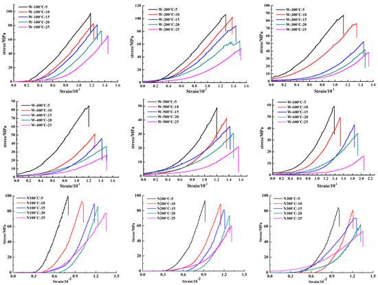 At the initial stage of loading (compaction stage), their curves reduce with the increase in the number of cycles. It shows that the compression deformation of the sample is caused by the change in load, which is mainly caused by the compaction of the micro-cracks in the sample caused by thermal stress. Then, the stress–strain curve shows a straight-line state in the elastic stage. Finally, the failure stage is entered. After the failure, the stress of the sample decreases rapidly, the overall bearing capacity is lost, and brittle failure occurs to the rock.