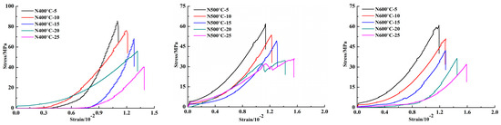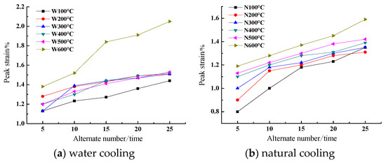 At the same temperature, the peak strain also increases with the increase in cycle times [33]. The peak strain of the samples under both cooling methods increases with the increase in temperature and cycle times, but the peak strain of the samples under water cooling is greater than that under natural cooling. The peak strain of the sample under water cooling increased from 1.44 × 10−2 at W100 °C-25 times to 2.05 × 10−2 at W600 °C-25 times, with an increase of 0.61 × 10−2 and an increase of 29.75%. The peak strain of the sample under natural cooling increased from 1.35 × 10−2 at N100 °C-25 times to 1.59 × 10−2 at N600 °C-25 times by 0.24 × 10−2, with an increase of 15.1%. This is mainly because there are many pore fractures in the sample cooled by water. In the process of compression, the pore fractures are first compacted and then destroyed. However, naturally cooled samples have a relatively dense interior and few cracks, so the compression time is relatively short, which will lead to the decrease in peak strain at last.