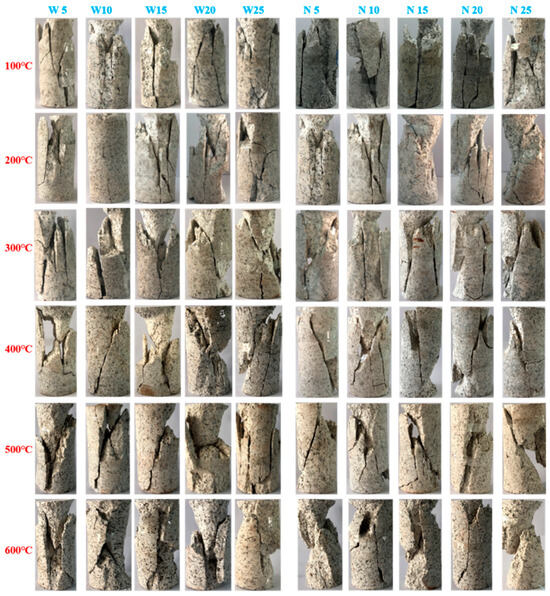 The following can be deduced from Figure 6: (1) The samples are mainly conical failure and splitting failure modes after failure. And by producing a large number of pieces, the sample in the destruction will give out a violent sound. (2) When the sample in the high temperature stage, the sample mainly exhibits shear failure. When the temperature is greater than 500 °C and the number of cycles is higher than 15, the sample will fail at that moment. The impact of the head on the test machine is gradually reduced, and the sound produced during the break is also gradually reduced. This indicates that the strength of the sample at high temperature and high cycle times is lower than that at low temperature and low cycle times. (3) When the temperature is greater than W500 °C, with the increase in cycles, the mode after the failure becomes more and more complex, and the sample after the failure is relatively loose and easy to be broken. (4) It can be seen from the figure that the sample changes without rules after failure under the two cooling methods. It is worth noting that the top end of most samples in Figure 6 mainly exhibits conical failure. This is mainly due to the relatively hard texture of granite, so the strength is higher than other rocks, and the end effect is obviously prominent. The end effect is caused by the unidirectional force of friction inhibition. It may also be the phenomenon of stress concentration caused by thermal stress under real-time temperature.