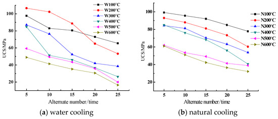 The results show that the cyclic action has great influence on uniaxial compressive strength. (3) The uniaxial compressive strength of both cooling methods showed a downward trend. But the drop in water cooling is greater than the drop in natural cooling, Sample W100 °C-5 times under water cooling is 49.9% of that under W600 °C-5 times, while sample N100 °C-5 times under natural cooling is 38.54% of that under N600 °C-5 times. There are mainly two reasons for the difference: (1) The sample under the two cooling methods contains a certain amount of water. However, in the process of heating, the water gradually evaporates; that is, dehydration occurs. The evaporation of water creates cracks between the particles, which can lead to microcracks in the rock and ultimately affect the strength of the sample. The sample under water cooling has more water in it than the sample under natural cooling due to the process of repeated heating and water cooling. In the process of continuous water immersion and evaporation, the cracks in the water-cooled sample are continuously expanded. when the sample is loaded, the rock will expand through microcracks until it is destroyed. The naturally cooled samples were heated and cooled on the basis of the previous one, so the strength of the samples declined with the increase in the number of cycles, but not as much as that of the samples cooled by water. It also shows that the samples have certain influence on the uniaxial compressive strength of rock under the action of cold and hot cycling.