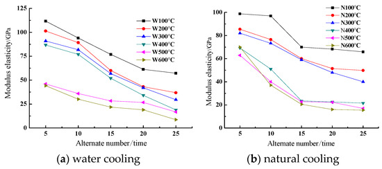 As can be seen from the average elastic modulus curve of the sample in Figure 8, (1) With the increase in temperature, the elastic modulus as a whole shows a downward trend. This is consistent with the research results of [32], which may be because when the temperature rises, the internal non-uniform thermal stress will increase the fracture density inside the sample. As a result, the elastic modulus of the sample decreases continuously, from W100 °C-5 times to 48.76% of W100 °C-25 times. (2) In addition, the elastic modulus of the sample decreases with the increase in cycle times; the change law of the elastic modulus of the samples under the two cooling methods is that the decline in the elastic modulus of the samples after water cooling is faster than that of the samples after natural cooling. Compared with the normal temperature (20 °C), the elastic modulus of water-cooled and natural cooling decreased by 91.79% and 85.24%, respectively. It indicates that the change degree of samples under water cooling is greater than that under natural cooling. When the number of cycles reaches 15, it is the cut-off point of the two cooling methods. The sample larger than 15 times declines significantly. However, this difference may be caused by the fact that the sample cooled by water is subjected to the effect of temperature in the process of water contact, and the sample drops in temperature rapidly, and the surface of the sample drops rapidly. However, due to the slow transfer speed inside and outside the sample, a large temperature difference occurs, which leads to the damage of the rock.