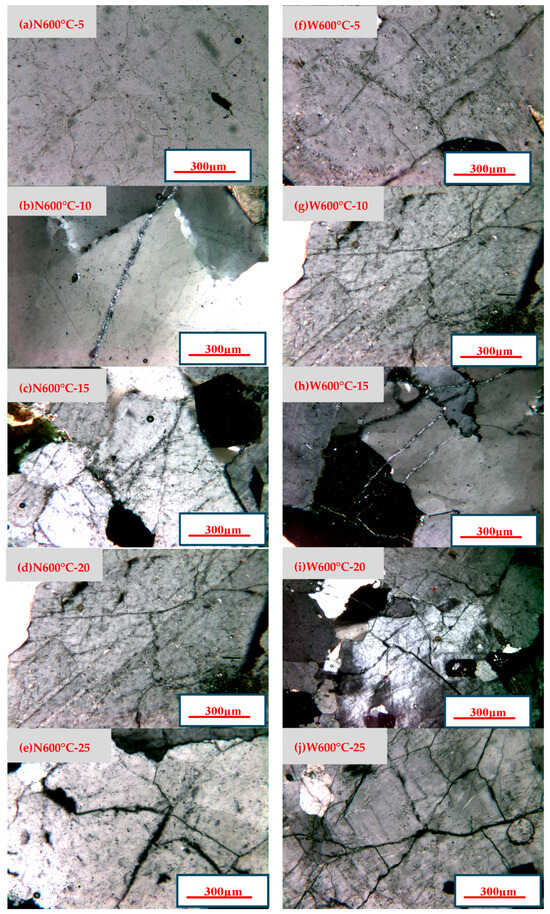 Figure 10 shows the microsection diagram of granite under two cooling methods of 600 °C cycling times and 15 times. As can be seen from the figure, the number of cracks in the sample increases gradually with the increase in the number of cycles, and the cracks become wider gradually. Fine holes and cracks can also be observed on the surface of the sample. However, with the increase in cycle times, the damage changes in the samples under water cooling are greater than that under natural cooling. This is mainly because the quartz crystal in the mineral content will undergo phase transition when the temperature of granite is 500 ~600 °C. When the temperature of quartz grain reaches 573 °C, it transforms from to. Under the effect of this temperature, the granite changes obviously, and the color gradually turns yellow. The ductility of the sample also increases gradually, and the strength also decreases rapidly.