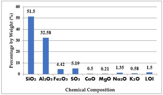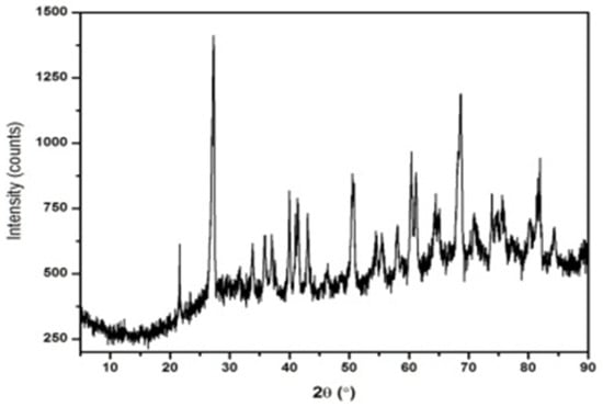 The present study used ordinary Portland cement (OPC) grade 53 conforming to IS 12269-1987 [28]. The physicochemical properties of the cement were tested as per IS 4031-1988 [29] and IS 12269-1987 [28]. Bottom ash (BA) was gathered from the Mettur thermal plant, Salem, Tamilnadu, India. It is an industrial by-product produced due to the burning of coal in thermal power plants [4]. The physical and chemical properties of bottom ash were studied. Bottom ash’s specific gravity and surface value are 2.17 and 3460 cm2/gm, respectively. The chemical composition of fly ash is shown in Figure 1. The XRD analysis was completed for the bottom ash; the test results are shown in Figure 2.