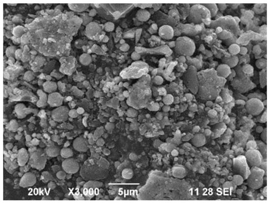 The test results show that the bottom ash had multiple peaks on the two-theta scale (ranging from 5 to 90 degrees), indicating that the BA had a polycrystalline structure. The SEM images of the bottom ash are given in Figure 3. Tiny spherical and semi-spherical particles were observed in varying sizes, and no visible pores were noticed. In this research, natural river sand was used as the fine aggregate. A sieve analysis test determined the grain size distribution as per IS 2386-1963 (Reaffirmed 2011) [30,31,32]. Using crushed aggregate of 20 and 12 mm in size, control and geopolymer concrete were produced as per IS 383-1970 (reaffirmed 2011) [33]. A total of 8 M sodium hydroxide in pellets were used as an alkaline activator in the geopolymer concrete. Also, sodium silicate in liquid gel was used along with sodium hydroxide solution to produce geopolymer concrete. Sulphonated naphthalene polymer Conplast SP430 superplasticizer was used in the present work, and it was purchased from FOSROC Chemicals Pvt. Ltd. (Guwahati, India). The specific gravity of the sulphonated naphthalene polymers was 1.220. Superplasticizer satisfies the recommendations of the IS code provisions.
