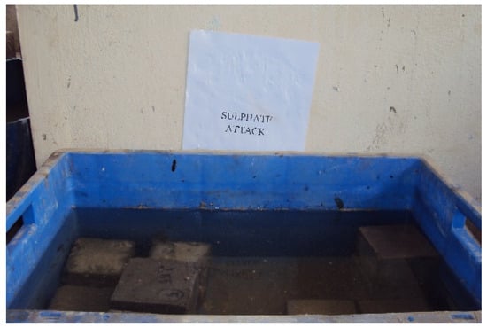 A sulfate resistance test was conducted for the control and geopolymer concretes to determine the resistance of the concrete samples against sulfate attack as per ASTM C 1012 [35]. A 100 mm × 100 mm × 100 mm sample was cast and cured for 28 days. The compressive strength of 100 mm cubes was calculated at a pace rate of 5 ± 1 N/mm2 per second, in accordance with IS 516 [36]. At ambient temperature, the cast specimens were immersed in a 5% magnesium sulfate solution for 180 days. After 7, 28, 56, 90, and 180 days, the concrete samples were removed from the sulfate solution, and the weight and the strength loss due to the sulfate attack were measured. The weight and the strength loss of the geopolymer concrete were compared with the control concrete to assess the sulphate resistance of the geopolymer concrete. Thirty specimens were cast and subjected to a sulphate resistance test, as shown in Figure 4.