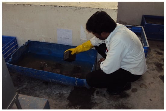 Specimens 100 × 100 × 100 mm in size were cast and cured for 28 days to determine the salt resistance of the control and geopolymer concretes. The cast specimens were immersed in 3.5% NaCl solution for 180 days at ambient temperature, as shown in Figure 5. After 7, 28, 56, 90, and 180 days, the concrete samples were removed from the salt solution, and the weight of control and geopolymer concretes was determined. The percentage variation in weight and strength loss of the concrete was calculated based on the test values, and the salt resistance was determined. In total, 30 specimens were cast and tested for salt resistance.