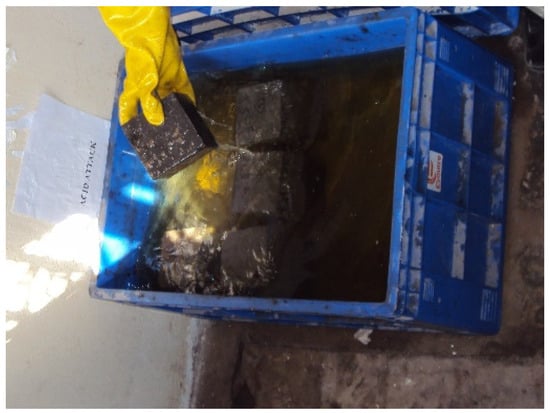 The acid resistance of the control and geopolymer concrete specimens 100 mm × 100 mm × 100 mm in size was tested as per ASTM C 642 [37]. The cast specimens were cured for 28 days and were immersed in 3% HCl solution for 180 days at room temperature (Figure 6). After 7, 28, 56, 90, and 180 days, the concrete samples were removed from the HCl solution to determine the weight and strength loss. Acid resistance was determined based on the variations in weight and strength loss of the concrete samples. A total of 30 specimens were cast and tested for acid resistance.
