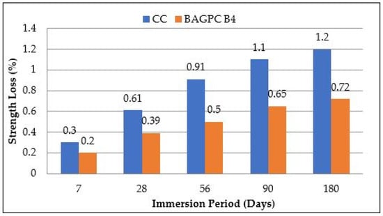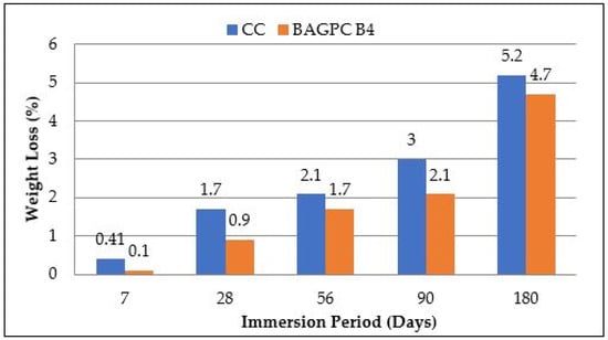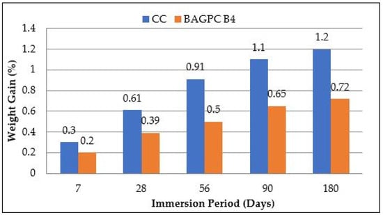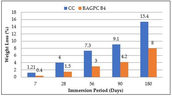 Salts are present in seawater, wind from the shore, soil, and groundwater, which can affect the quality of concrete. The permissible limit of chloride for construction purposes is up to 500 ppm, as per IS 456-2000 [39]. The weight gain and the strength loss of BAGPC B4 and CC immersed in 3.5% NaCl solution at 7, 28, 56, 90, and 180 days are presented in Table 4.