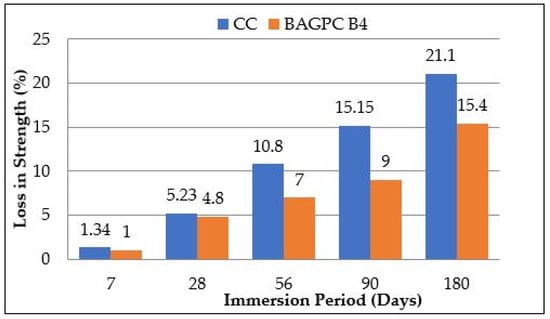 Compressive strength loss of CC and BAGPC specimens due to acid attack.