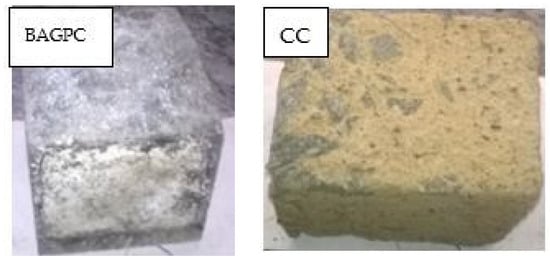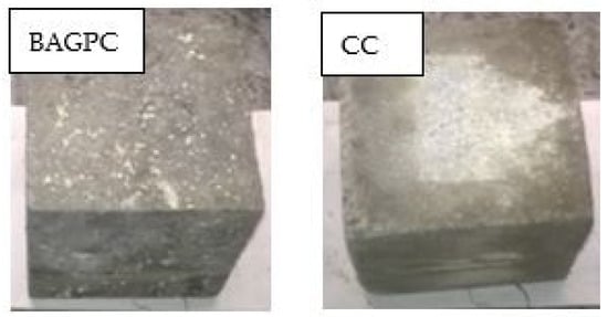 Figure 10 shows the BAGPC and CC specimens immersed in the hydrochloric acid solution for 180 days. Due to the acid attack, the CC specimen experienced surface deterioration and damage. However, the BAGPC specimen did not have any damage or deterioration. It is evident that the BAGPC specimens were less porous and had less sorptivity.