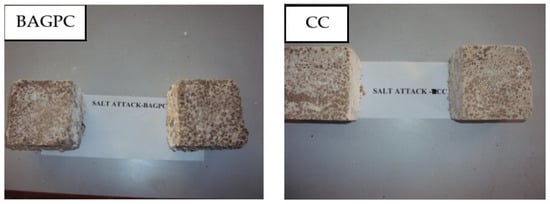 Compressive strength loss of CC and BAGPC specimens due to salt attack.