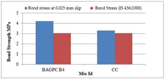 The load transfer to the structure depends on the bonding between steel and cement paste. As shown in Table 5, for 28 days, the bond strength of the control mix (CC) for 0.025 mm and 0.25 mm slips was 3.29 MPa and 4.98 MPa, respectively, whereas BAGPC B4 showed 4.22 MPa and 5.61 MPa for 0.025 mm and 0.25 mm slips, respectively.