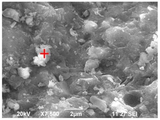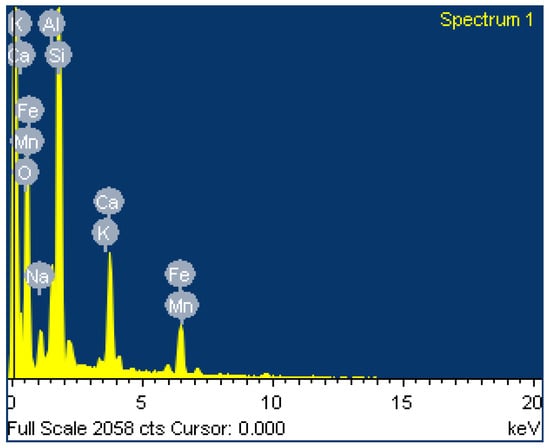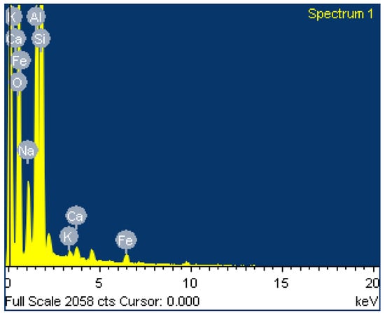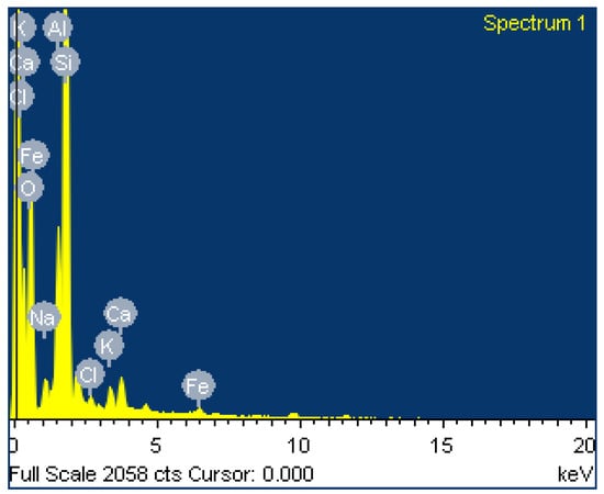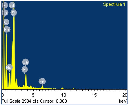SEM images of the B4 mix after 180 days of immersion in 3% HCl, 5% magnesium sulphate, and 3.5% NaCl solution are presented in Figure 20, Figure 21 and Figure 22, respectively. The B4 mix immersed in 3% HCl solution for 180 days showed fewer pores because of the leaching process of geopolymer paste aluminum and sodium in an acid solution. The B4 mix immersed in magnesium sulfate solution showed the minimum needle-shaped particles because the bottom ash geopolymer paste had a lesser Ca compound. The bottom ash geopolymer paste was less susceptible to magnesium sulphate attack than CC. The B4 mix immersed in NaCl solution exhibited strong geopolymerization of the bottom ash geopolymer paste free from pores and had no surface elimination. The element composition of O, Na, Al, Si, K, Ca, and Fe from the EDAX spectrum is presented in Figure 23, Figure 24 and Figure 25, respectively.