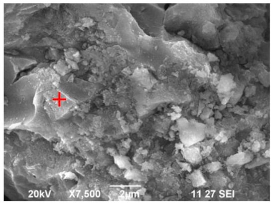 SEM and EDAX analysis of the B4 mix were made to evaluate the microstructure and the degree of geopolymerization element composition. The SEM and the EDAX images of the B4 mix are shown in Figure 18 and Figure 19, respectively. The B4 mix (Figure 18b) showed a dense bottom ash geopolymer paste microstructure. Also, fewer partially and non-reacted particles, such as silica and alumina, reacted with alkaline liquid to produce thick N-A-S-H gel (Villa et al., 2010 [10]). The bottom ash geopolymer paste had no ettringite formation at 28 days in the B4 mix. The SEM of CC (Figure 18a) showed the presence of C-S-H gel and a small amount of CH. Figure 19 shows an element composition of oxygen, sodium, aluminum, silica, calcium, and iron in the B4 mix.