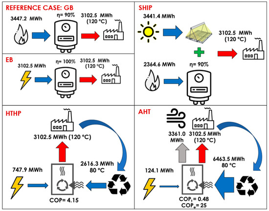 Figure 1 helps to recognize the main differences between the technologies studied in terms of performance and energy sources. Although HTHPs consume more electrical power than AHTs, they also require less waste heat and do not need to dissipate heat to the ambient. AHTs present the main advantage of consuming a very small amount of electricity. SHIP systems are not self-sufficient since there is practically no useful heat that can be produced in days with minimal direct normal irradiation. Thermal energy storage is still to be proven from an economic point of view in this specific temperature range. Thus, SHIP systems require a backup, which, in this case, is a GB. Finally, EBs consume more electricity than HTHPs or AHTs, but they have the main advantage of their simplicity and relatively low Capital expenditures (CAPEX) compared to the HTHPs or AHTs.