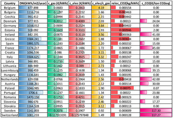 The model also requires country-dependent parameters (Figure 3), such as the cost of gas and electricity in each country. The study covers European countries. The energy costs were obtained from the EUROSTAT database (year 2022) [41], as in recent techno-economic assessments [10]. Although the prices include all taxes and levies, in practice, real prices can differ significantly, even in the same country, depending on the size of the industry, the electricity or gas tariff, etc. For this reason, a parametric study is performed in Section 3.1. The CO2 emissions of the electricity consumption in each country [40] and the cost of these emissions [42] are included in Figure 3.