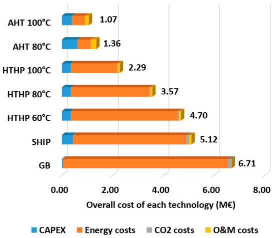 Overall cost (Equation (11), M€) of each technology in Spain for process heat at 120 °C.
