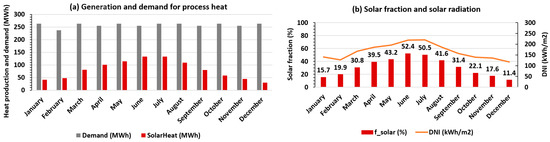 Figure 5a represents the monthly thermal demand (grey histogram). The demand is practically the same every month, given that every day follows the same schedule and that the only monthly difference is the number of days per month. The net solar heat (in red) reaches its maximum in summer when the maximum DNI is reached (Figure 5b, orange curve). SHIP systems are generally sized for an annual solar fraction of around 30% [25]. The collectors (1728 m2) were sized to reach this value (30%). For other countries of Europe, the same collector surface was kept in order to study the same system in all locations. Furthermore, it would be necessary to increase significantly the collector surface in regions with low DNI in order to reach this value without any thermal energy storage system, thus increasing the investment cost.