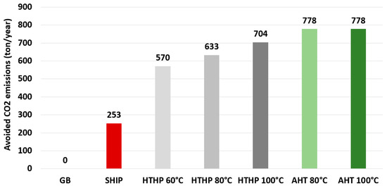 The annual CO2 emission savings are illustrated in Figure 6. The reference is the GB scenario, which emits around 807 tons/year. The absolute CO2 emissions are consequently 807 tons/year minus the avoided emissions indicated in Figure 6. The AHT scenarios avoid more CO2 emissions, followed by the HTHP, due to their COP. The SHIP system, sized for 31% of solar fraction, would avoid 253 tons CO2/year. More collectors could be potentially added, but the total cost (Figure 4) would increase substantially. At the same time, the payback would presumably decrease, given that part of the solar field would have to be defocused in summer to avoid producing more heat than demanded.