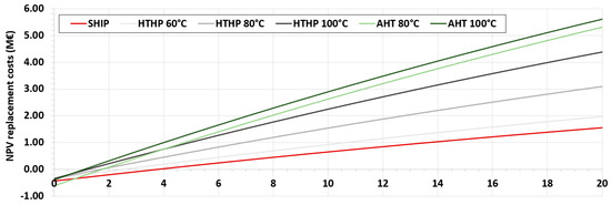 The overall cost obtained with Equation (15) is illustrated in Figure 4. Only the economically feasible scenarios are represented, or in other words, the scenarios where the CAPEX can be recovered before 20 years. For this reason, the EB case is not represented in Figure 4. The most expensive scenario is with the GB, yielding a total cost of 6.71 M€. The lowest total cost is obtained with the AHT (1.36 M€), followed by the HTHP scenarios. For both technologies, the higher the waste heat temperature, the more economic since the system efficiency is higher. The SHIP system involves a total cost of 5.12 M€, which is relatively close to the HTHP 60 °C case (4.70 M€).