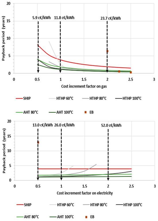 Given that the main uncertainty in the techno-economic analysis is the cost of electricity and gas, which are very variable, a specially devoted parametric study is performed in Figure 8. The inflation rate of gas and electricity was kept equal to 3%, but a scale factor was introduced with respect to the energy costs of 2022. This scale factor is from 0.5 up to 2.5, with increments of 0.25. This implies absolute costs of gas in the range from 5.9 to 23.7 c€/kWh, and 13.0 to 52.0 c€/kWh for electricity. PBs higher than the service life of the installations (20 years) have not been represented.