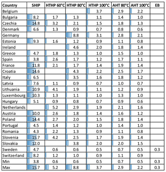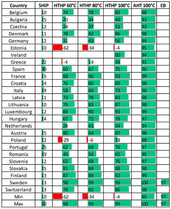 Figure 7 provides useful information to determine if replacing the current industrial gas boilers with other technologies is economically feasible (retrofit situation). After 20 years, and with the energy prices of the EUROSTAT 2022 database, several of the technologies lead to positive NPV values. The highest absolute benefit is obtained with the AHT, followed by the HTHP. The payback periods are relatively low, and generally, all before four years. Nevertheless, the key point is that waste heat should be available at a minimum of 60 °C for the HTHP or at 80 °C for the AHT. The detailed values of the payback period are discussed in the following Section 3.2 on a European level.