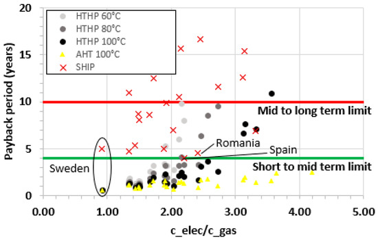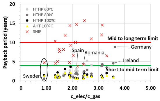Industries are generally more willing to incorporate new technologies when they involve short-term investments (PB values below four years approximately). These values can be potentially obtained in most of the countries using AHTs and HTHPs. Some exceptions are countries such as Germany or the Netherlands in the HTHP 60 °C scenario (lower COP and relatively high electricity-to-gas cost ratio).