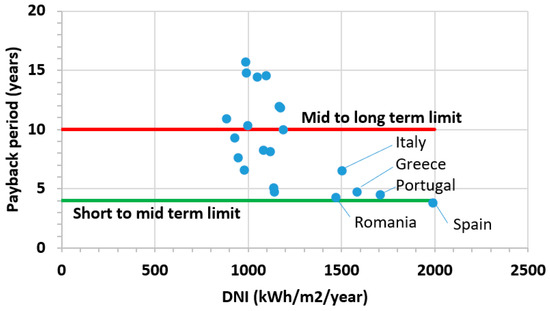 The SHIP scenario requires specific attention since the payback periods are not so directly correlated with the electricity-to-gas cost ratio. Their economic benefit depends mainly on the CAPEX, the price of gas, and the DNI. Figure 11 represents the payback period of the different countries as a function of the DNI. Although the payback is also dependent on the price of gas, in general, all countries with DNI values above 1400 kWh/m2/year lead to payback periods between 4 and 5 years, which are close to short-term investments. Given the high inflation on gas between 2021 and 2023, many new SHIP systems are actually being built in these countries. Romania is an interesting case where the DNI value is lower than in Portugal and Spain, but the payback period is similar. The reason for this is that the price of gas is around 18 c€/kWh, compared to 12 c€/kWh in Portugal and Spain.
