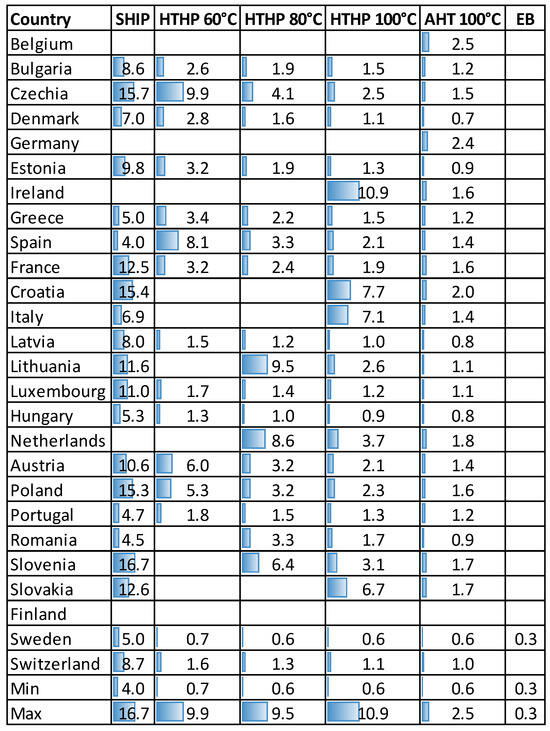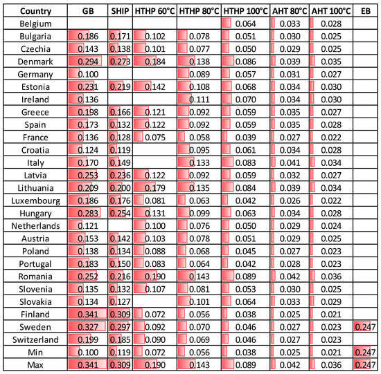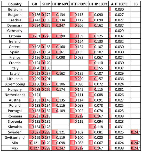 Figure 12 illustrates the LCOH of the different technologies whenever the investment is economically feasible. The lowest LCOH values are obtained with AHTs (ranging from 2.1 to 4.2 c€/kWh) depending on the country, followed by the HTHPs (3.8 to 19 c€/kWh). The SHIP LCOHs are in the range of 11.9 to 30.9 c€/kWh, which is close to the LCOHs values of GBs (10.0 to 34.1 c€/kWh). However, in countries with a high DNI, such as Spain, the LCOH of SHIP systems can reach values of around 13.2 c€/kWh, which is lower than 17.3 €/kWh (GB scenario in Spain). As in previous tables, the values of scenarios with payback periods below 20 years are not included. This is the case of Belgium in many scenarios, except for those with waste heat temperatures above 80 °C.