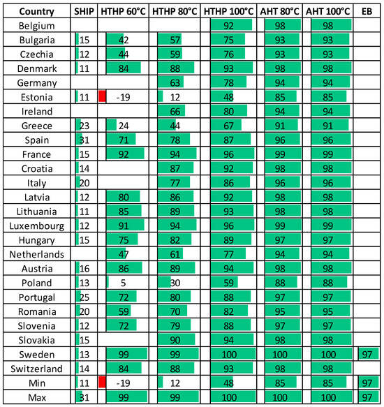 Finally, Figure 13 represents the yearly CO2 emission savings as a % variation with respect to the GB case. Practically all scenarios help reduce the CO2 emissions (green color), except for the HTHP with waste heat at 60 °C in Estonia (red color). In Poland, this scenario only reduces the CO2 emissions by 5%. The reason is that these two countries are among those with higher CO2 emission rates in their electricity production, as discussed at the beginning of Section 3.2. AHTs, given their high COPel, can reduce CO2 emissions from 85 to 100%. This upper value is reached in Sweden, which has very low CO2 emission rates in electricity production since most of it is produced with hydraulic and nuclear power. HTHPs also enable a significant reduction in CO2 emissions. With the mean waste heat temperature of 80 °C, the CO2 emission reduction is in the range from 12% (Poland) to 99% (Sweden).