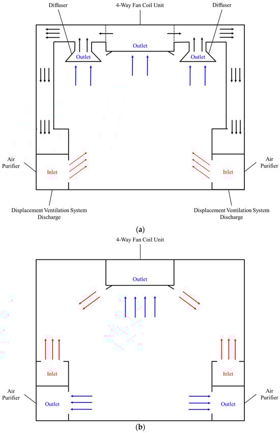 Schematic of ventilation systems: (a) displacement ventilation system (DVS) devised in this study; (b) 4-way fan coil unit and air purifiers operated independently.