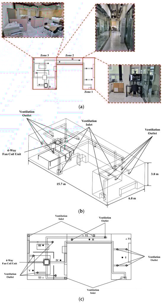Figure 2a is a photograph showing the office space where the DVS was installed. Zone 1 is a tea-making room with minimal furniture. Zone 2 is a narrow corridor. Zone 3 is the office space containing desks, chairs, and partitions. Figure 2b,c illustrates the schematics of the office space with the newly designed DVS in this study. One 4WFCU was positioned in the center of the ceiling of Zone 3. Zone 1 featured four diffusers and one AP, Zone 2 had two diffusers and one AP, and Zone 3 utilized four diffusers and two APs. The air drawn from the office space using the 4WFCU and ten diffusers mounted on the ceiling was mixed in appropriate proportions, temperature-controlled, and then reintroduced into the office space from the outlets of four APs located on the floor. All the used ducts were well insulated.