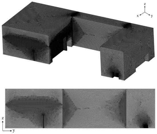 Here, ρ represents air density, ui denotes air velocity, and Φ represents the age of air. The diffusion term, j, is determined by both molecular diffusivity, Dm, and turbulent diffusivity, Dt. The total ventilation rate was set to the lowest value of 432 m3/h or the highest value of 2160 m3/h. The flow rates for each supply inlet or exhaust outlet were determined by dividing the total ventilation rate by the number of supply inlets or exhaust outlets. The indoor pressure was set to 101.3 kPa, and the office temperature was adjusted to 22 °C or 27 °C. For boundary conditions in flow simulation, a no-slip condition was applied to every indoor wall, a velocity inlet condition was set for every ventilation inlet, and a pressure outlet condition was applied to every ventilation outlet. Convergence was considered achieved when the residuals for all solved equations were below 10⁻4. Since brand-new HEPA filters were used in the experiments, the zero value for the age of air was applied to all outlets of the APs by assuming nearly 100% removal efficiency of the HEPA filters. Tetrahedral grids were used for the mesh system, with grids near the supply inlets and exhaust outlets being denser. A grid independence test was conducted by increasing the total number of grids from approximately 5 million to 23 million, resulting in approximately 10 million grids used, as shown in Figure 4, to observe the distribution of the age of air.