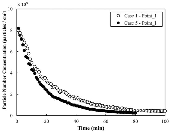 Figure 5 provides an example of the temporal variation of particle concentration measured utilizing OPCs. It shows the particle concentration variation at Point I while the ventilation system was operating under stable indoor airflow conditions after stabilizing the indoor airflow in Case 1 and Case 5 conditions, with a constant ventilation rate. Because of the ventilation system operation, indoor air was expelled and particle-free air was introduced, resulting in an exponential decay in particle number concentration. While variations existed in the rate of reduction depending on the experimental conditions and measurement locations, the particle concentration decreased exponentially in all cases. Therefore, the experimental method was used to compute the age of air utilizing the following equation [35,36,37].