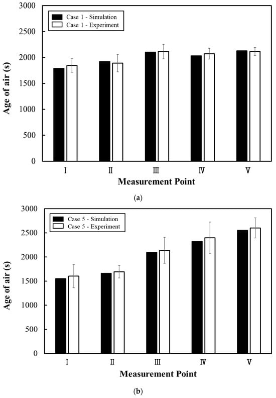 Comparison of the age of air between experiment and simulation: (a) Case 1 for the office equipped with DVS; (b) Case 5 for the reference office equipped with 4WFCU and APs.