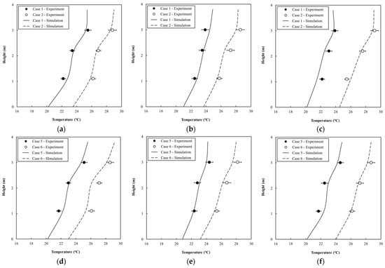 Comparison of temperature distribution between experiment and simulation: (a) Case 1, T1, (b) Case 1, T2, (c) Case 1, T3, (d) Case 5, T1, (e) Case 5, T2, (f) Case 5, T3.