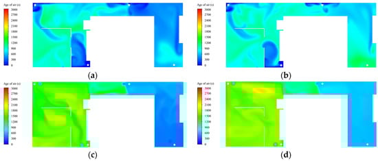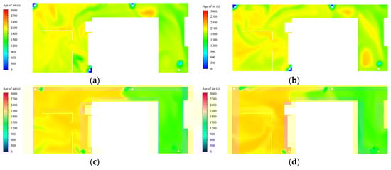 Contour of the age of air at 1.1 m height (ventilation rate 2160 m3/h): (a) Case 3—office with DVS with temperature setting of 22 °C; (b) Case 4—office with DVS with temperature setting of 27 °C; (c) Case 7—reference office with temperature setting of 22 °C; (d) Case 8—reference office with temperature setting of 27 °C.