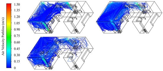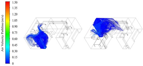 On the other hand, when comparing the age of air based on the ventilation system (i.e., comparing Figure 9a,c; Figure 9b,d; Figure 10a,c; Figure 10b,d), two main features can be observed. Firstly, in Zone 1, the central space was mostly empty without any significant obstacles to hinder the airflow, and there was no 4WFCU installed on the ceiling. Therefore, in Cases 5, 6, 7, and 8, clean air supplied from a single AP could circulate freely and extensively in Zone 1, whereas in Cases 1, 2, 3, and 4, the air discharged from the APs on the floor was dispersed and sucked through four diffusers installed on the ceiling, resulting in a somewhat more complex flow pattern and a relatively wider distribution of stagnant air zones. This aligns with previous research findings of Oh [46] and Choi and Kang [47], indicating that the interference between air currents intensifies as air currents become more pronounced in a space, potentially causing particles to recirculate or linger in specific zones. For these reasons, it was determined that the age of air in Zone 1 was slightly lower in the reference office compared to the DVS-equipped office. Secondly, in the center of Zone 3, there were multiple office furniture items, such as two office desks and partitions, which constituted obstacles to the airflow, and there was a 4WFCU installed on the ceiling along with two APs on the floor. In contrast to Zone 1, Zone 3 showed a lower age of air in the DVS-equipped office compared to the reference office. In spaces where ventilation is taking place, it is crucial for the discharged air currents to be effectively drawn into exhaust outlets. However, when there are obstacles within the space, the air flow may not be smooth, potentially becoming a hindrance to improving air quality [48,49]. To more clearly explain this, the pathlines of the discharged air flows for both the DVS-equipped office and the reference office at a ventilation rate of 2160 m3/h are shown in Figure 11 and Figure 12, respectively. As shown in Figure 11, in the DVS-equipped office, the flows discharged from the two APs on the floor in Zone 3 did not significantly interfere with each other while being sucked through the 4WFCU and diffusers on the ceiling, resulting in smooth localized ventilation. Consequently, the stagnant air zones decreased, leading to a lower age of air. In contrast, as shown in Figure 12 for the reference office, significant interference was observed among the flows discharged from the two air purifiers on the floor and the 4WFCU on the ceiling. This interference disrupted the flow pattern, causing less efficient air circulation, larger stagnant air zones, and a higher age of air in the reference office. From these findings, it can be inferred that, instead of independently operating multiple APs on the floor and 4WFCU installed on the ceiling, connecting them through ductwork to convert them into the DVS designed in this study can significantly contribute to improving indoor air quality.