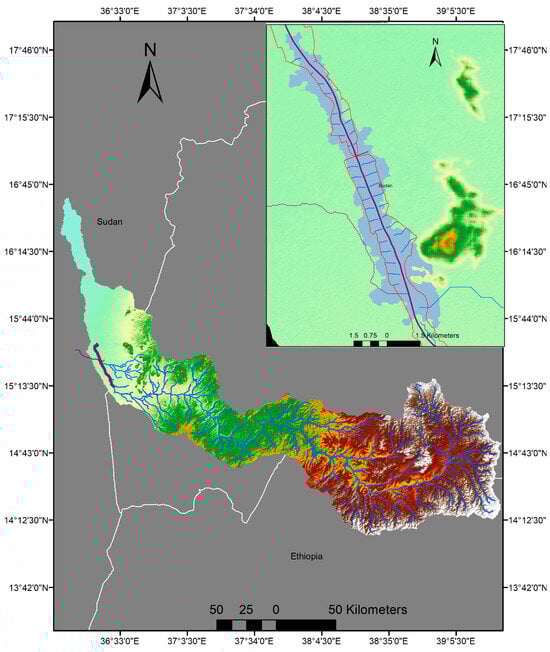 During the rainy season, the Gash River’s flows are highly variable. It is dry from November to June. The rainy season typically begins in June and ends with a succession of flash floods in September []. The steep and irregular topography of the upper third and, partially, the middle third of the basin, inadequate vegetation cover, and unfavorable geological formations, which are linked to poor soil formation and low infiltration rates, are the main causes of flash floods and high sediment load. Flooding has been occurring repeatedly in Kassala town in the downstream plains in the bottom third of the basin; for instance, it has been claimed that major floods occur every 1 to 5 years [].
