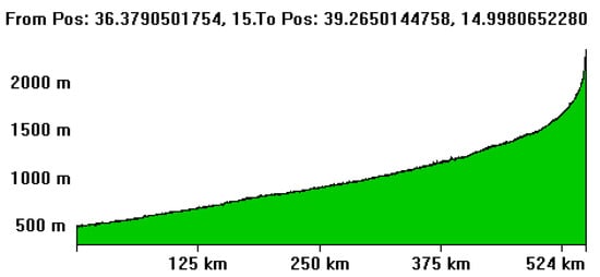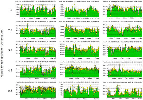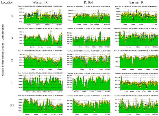 This study uses a digital elevation model (DEM) to identify the elevation points on the Gash River riverbed and balance them with the elevation points on the eastern and western banks of the river adjacent to Kassala town. These points were used to identify the impact of structural and non-structural measures on flood risk mitigation in the Gash River and disclose the influence of these measures on changing riverbed levels []. The critical flooding area near Kassala was divided into sections with a distance of 500 m, limited by constructed spurs for flood measures along the river course. In each section, the average elevation points were generated by using the Global Mapper interface, as were the sections around the river banks.