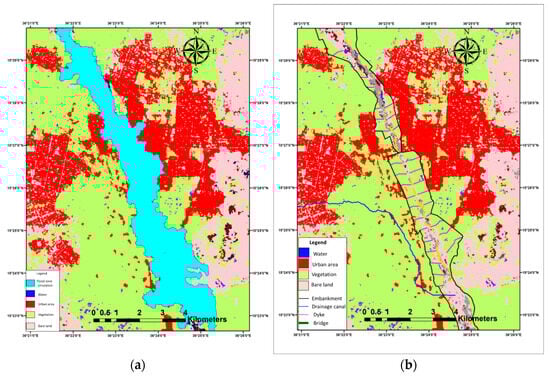 Embankments, dikes, bridges, spurs, and diversion channels were frequently constructed between the 1960s and the 1980s. Notably, it is thought that the structural activity will immediately reduce the flash flood hazard and regulate it effectively []. However, with some of these measures, their effectiveness decreased with time due to a variety of reasons, including changes in land use/cover, construction without a plan, and increasing population in flood-protected locations; hence, in any of these occurrences, disastrous flood consequences are possible [].