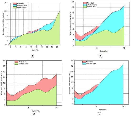 The study results show the extraction of the layers of the riverbed on the western and eastern banks and their correlation to flood occurrence. The eastern bank was most affected by flood. The variation attributed to the Gash River morphology changed according to sediment precipitation in the riverbed and sediment loading by flood water in the catchment area. The construction of embankments, dikes, and spurs affected the sediment conveyed by floodwater; however, the river is perennial in Eritrea before turning ephemeral as it approaches Sudan []. The plateau is between 2000 and 2500 m above mean sea level (MSL), but as the river enters the Sudan Plains, its elevation falls to around 600 m then dips much more to 500 m at Kassala town and at a 35 km distance from Al Gira Point at the Eritrean border. As a result, the current’s velocity decreases, and the river’s silt load starts to precipitate []. The construction of the 22 dikes and spurs exacerbates the sediment precipitation and leads to a rising riverbed.