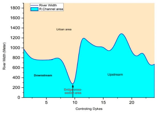 According to a 1976 survey, the ground level in Kassala town is typically 10 cm higher than the Gash riverbed level on the downstream side of the bridge []. This shows that training and protection work in this zone, which primarily involves dry pitching, has implemented defined design and construction systems. The river’s channel carrying capacity being trained as a result of flow-blocking infrastructure in the form of bridges, spurs, and dikes is another major factor contributing to the rising water level. Moreover, morphological changes like the increase in the riverbed and the change in slope contribute to the rise in river levels (Figure 8).
