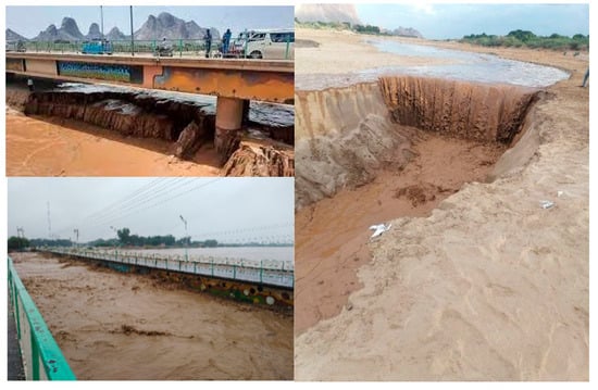 Flash floods pose a significant hazard to many regions around the world, including the Gash River in eastern Sudan [,]. The Gash River catchments experience sudden and torrential rainfall events during the rainy season, leading to frequent flooding. These floods cause a considerable loss to urban facilities, including housing, infrastructure, livelihoods, and agricultural lands in the region []. Therefore, effective measures for flood risk mitigation are crucial to saving lives and assets []. To ensure the efficiency of flood risk mitigation measures in the Gash River at Kassala, it is important to assess the impact and results of both structural and non-structural measures []. The climate change implication of soil erosion in catchment areas affects the Gash River’s morphology, and potential ecological impacts have been considered []. Examining the Gash River’s hydrology and morphology and the causes of riverbed change, case studies, field observations, and hydrological models were utilized to evaluate the effectiveness of these measures in reducing flood risks [].