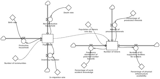 In this section, the researcher thoroughly explains the system dynamics approach for informal ASGM by using prevention methods in the Rarowatu Utara and Lantari Jaya areas. The identification of the results of the dynamic system model in Figure 2 shows two stages comprising input and output to determine the dynamic prevention chain within the framework of the anticipatory model of ASGM activities on population resilience. The first stage is to look at the input prevention factor from the dynamics system chain, as described through the population factor and the number of mine processing workers. This recognition of input prevention still requires further dynamic models that aim to capture causality beyond factors. The second step is to identify factor diagrams of ASGM activity and water availability which are input-continued causality loops and complement prevention models in dynamic system analysis. Most ASGM sites process the same seed material, so these two nodes are verified simultaneously in the dynamic system model. The two proposed models consider the flow of population factors, the number of mining workers, ASGM activities, and the availability of water to and from the mining location based on data obtained from the North Rarowatu and Lantari Jaya areas.